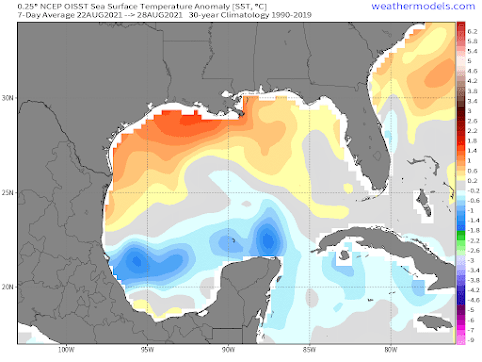 How unusual were the Gulf sea surface temperatures during the strengthening of Hurricane Ida? The figure below shows you the anomaly (or difference) from climatology (normal) of the sea surface temperatures before Ida strengthened (Courtesy of Ryan Maue, previously NOAA Chief Scientist).