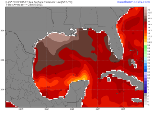 Below are the sea surface temperatures for the seven days immediately before Ida revved up and made landfall. Temperatures of the whole route of the storm were way above the necessary threshold. Warm water was no problem for development if Ida (29C and more pretty much the whole way).