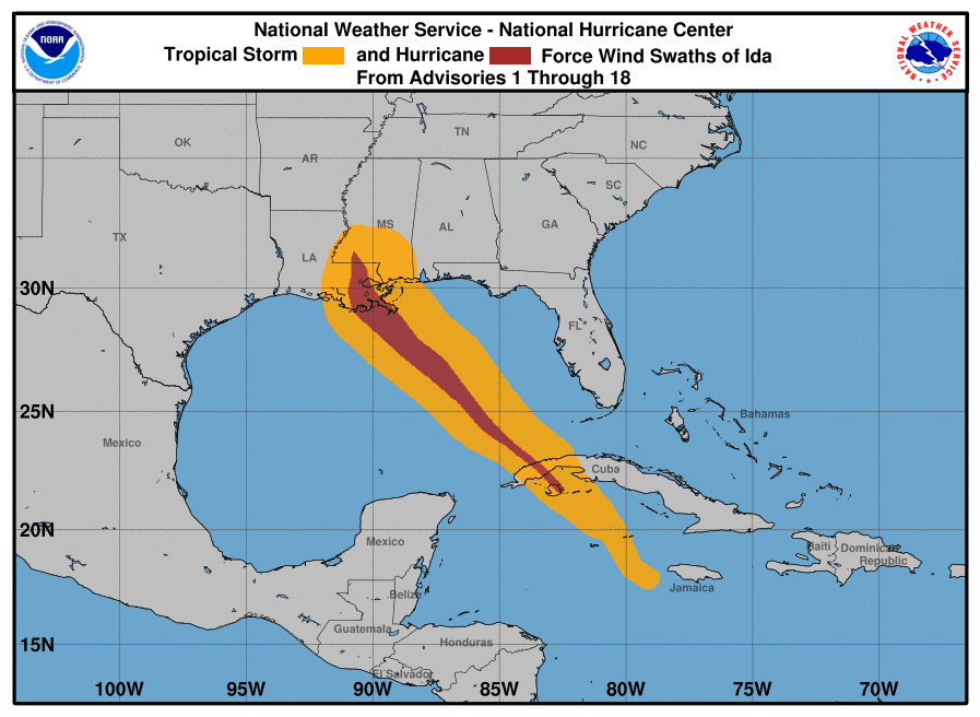 Keep in mind the track of Hurricane Ida, as illustrated by the official NOAA track information below. The shading shows you the locations of tropical storm and hurricane-force winds. The storm revved up to hurricane strength south of Cuba and really started to rev up north of 25N.