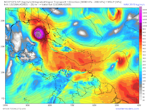 For Ida, there were some very favorable elements: little vertical wind shear (which tears the storms apart) and a plume of very moist air that got ingested into the storm (see a map of integrated water vapor transport, IVT, below).