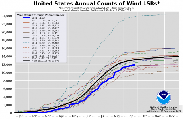 Tornadoes and Wind Damage reports are well below average