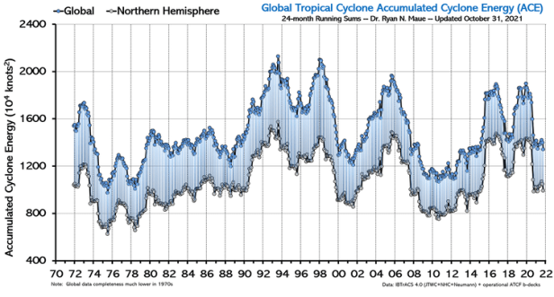 Last 50-years+ of Global and Northern Hemisphere Accumulated Cyclone Energy: 24 month running sums. Note the year indicated represents the value of ACE through the previous 24-months for the Northern Hemisphere (bottom line/gray boxes) and the entire global (top line/blue boxes). The area in between represents the Southern Hemisphere total ACE. Courtesy Dr. Ryan Maue