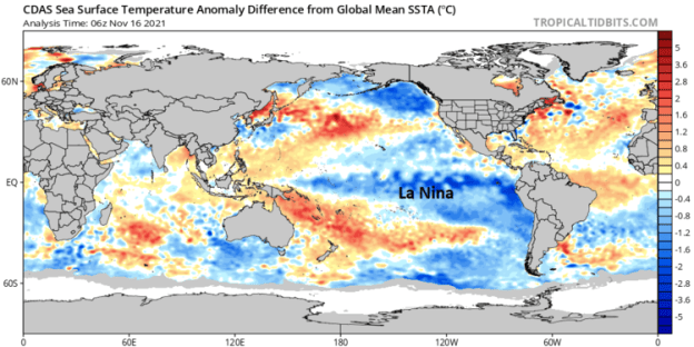 Colder-than-normal sea surface temperatures continue to dominate the scene in the equatorial part of the Pacific Ocean. These “La Nina” conditions likely played an important role in the above-normal tropical activity across the Atlantic Basin in 2021 and the below-normal activity in the Pacific Ocean. Map NOAA, tropicaltidbits.com