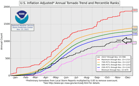 In terms of tornadoes, it has been another below-normal season in the US with no EF-5’s recorded. There was, however, tornadic activity in some unusual places in 2021 including the Mid-Atlantic and New England.