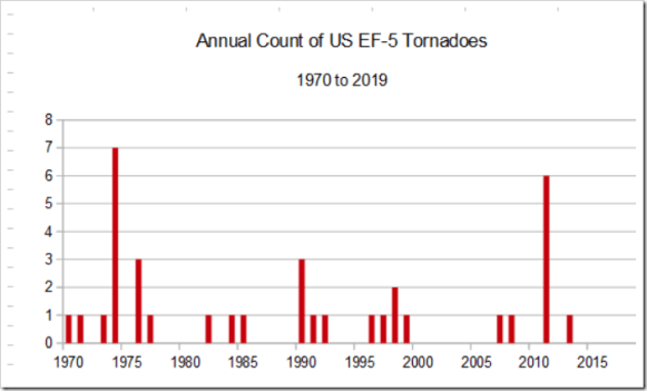 One of the notable findings of the 2021 US tornado season is that it featured no EF-5 tornadoes which are the most powerful of all. In fact, it has now been more than 8 years since the last EF-5 tornado struck in the US which was in Moore County, Oklahoma during May of 2013. According to NOAA, there have been a total of 36 EF-5 tornadoes in the US since 1970 with 14 of those occurring in the 1970s.