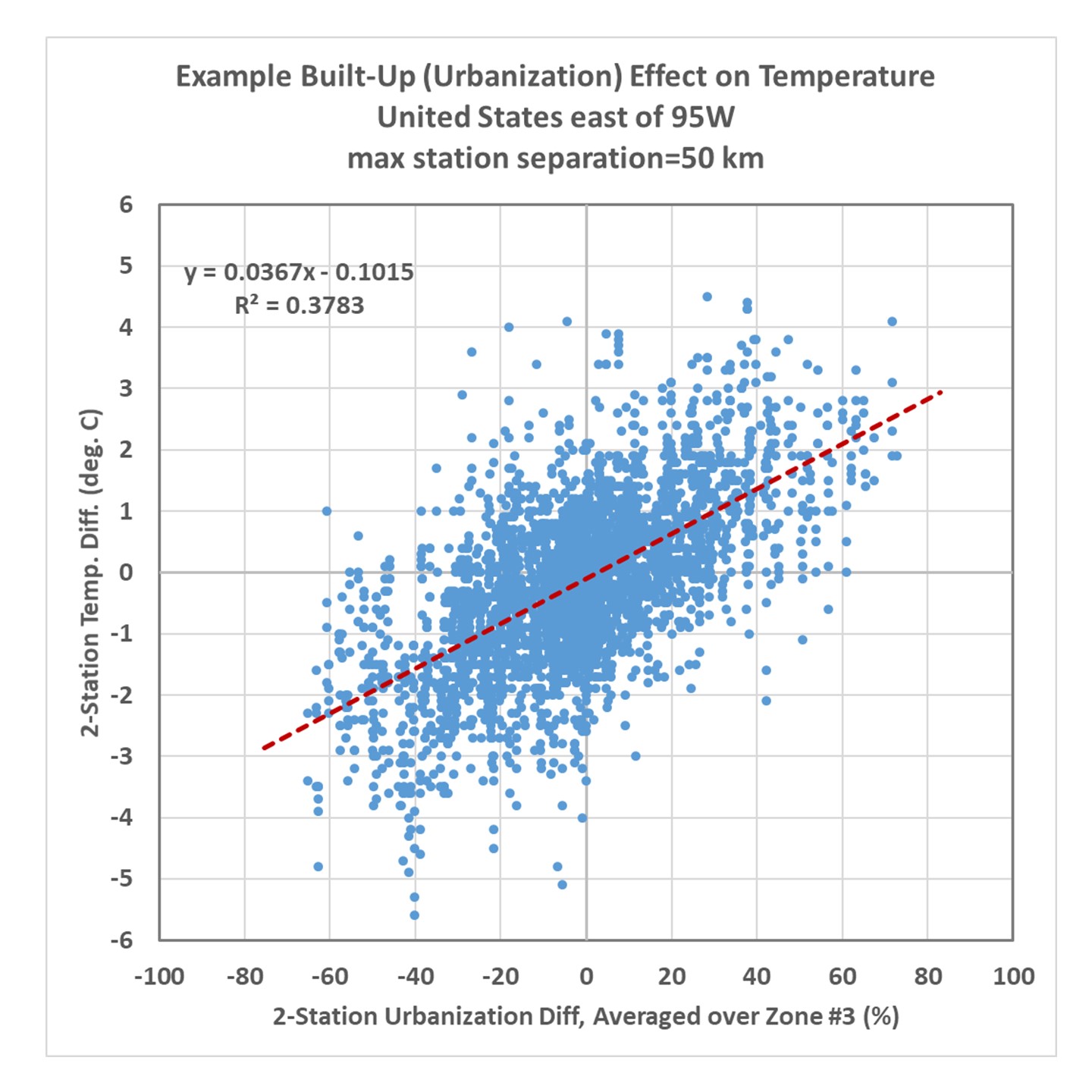 I applied the method to 269 stations having sufficient data to compute 50-year trends (1973-2022) for August 09 UTC temperatures, and Fig. 5 shows the raw temperature trends versus the de-urbanized temperature trends. When stations in each of the 37 states are averaged together, and the state averages are area-weighted, there is a 40% reduction in the average temperature trend for those 37 states.