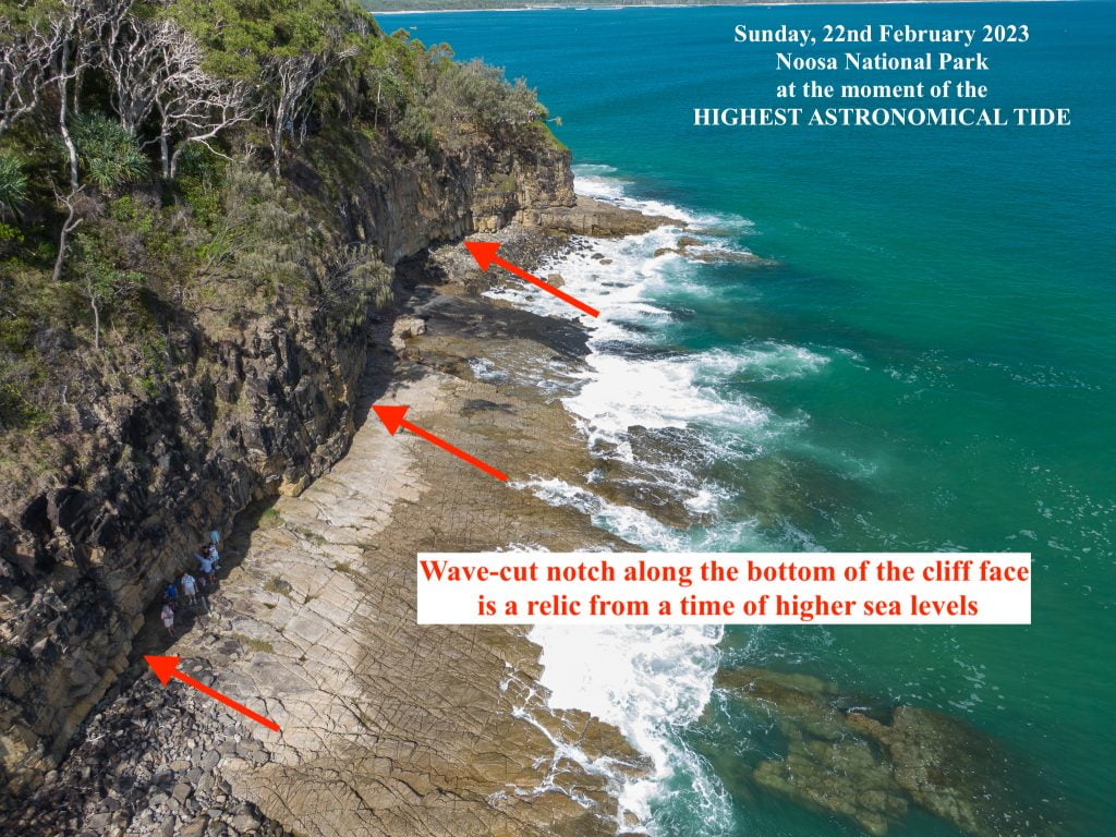 Alas, at the moment of the highest astronomical tide for 2023 – officially 8.32 am on Sunday 22nd January – the waves didn’t reach to the wave cut notch; not anywhere near it.