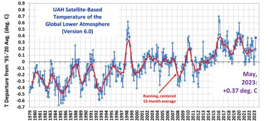 The post UAH Global Temperature Update for May, 2023: +0.37 deg. C first appeared on Roy Spencer, PhD..