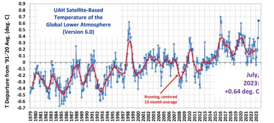 The post UAH Global Temperature Update for July, 2023: +0.64 deg. C first appeared on Roy Spencer, PhD..