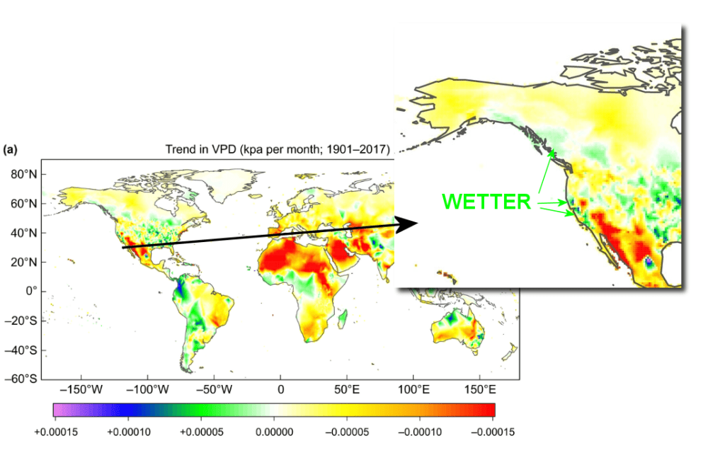 Most egregious of all, the Nature study itself ignored actual published data about VPD drying. The 2020 paper, Plant responses to rising vapor pressure deficit, examines actual data for the western U.S., specifically in the mountains of California, and shows VPD has decreased, indicating more moisture. These areas show VPD values that indicate more moisture, rather than less, and completely contradict the claims of drying made in the Nature study. This is seen in Figure 1 below, with both the U.S. and an expanded magnified panel showing the western area of the study. The green colors indicate wetter conditions.