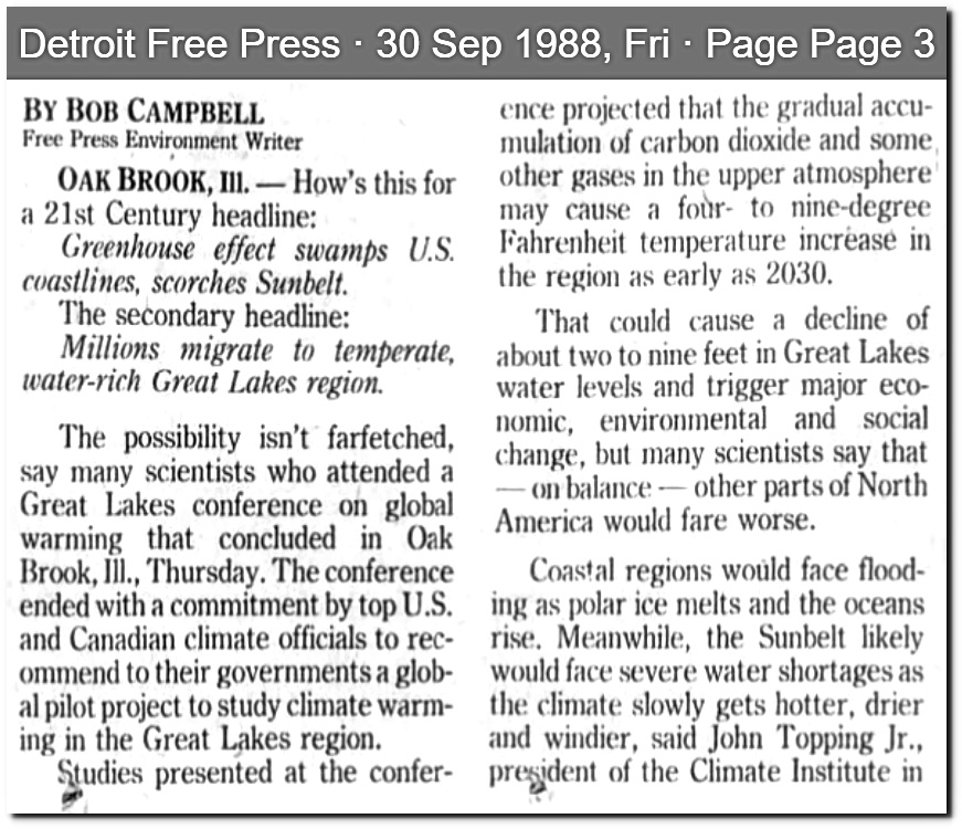 In 1988, experts predicted the Great Lakes states would warm 4-9 degrees and the lakes would lose 2-9 feet of water by the year 2030. This would cause millions of people to migrate there.