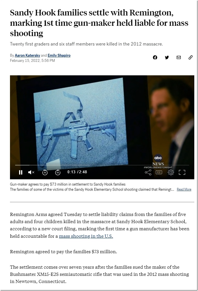 “The settlement comes over seven years after the families sued the maker of the Bushmaster XM15-E2S semiautomatic rifle that was used in the 2012 mass shooting in Newtown, Connecticut.”