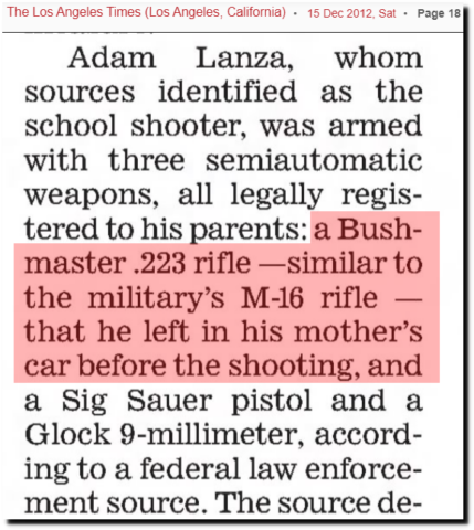 “The two pistols were found inside the school and a .223-caliber Bushmaster rifle was found in the back of his mother’s car in the parking lot.”