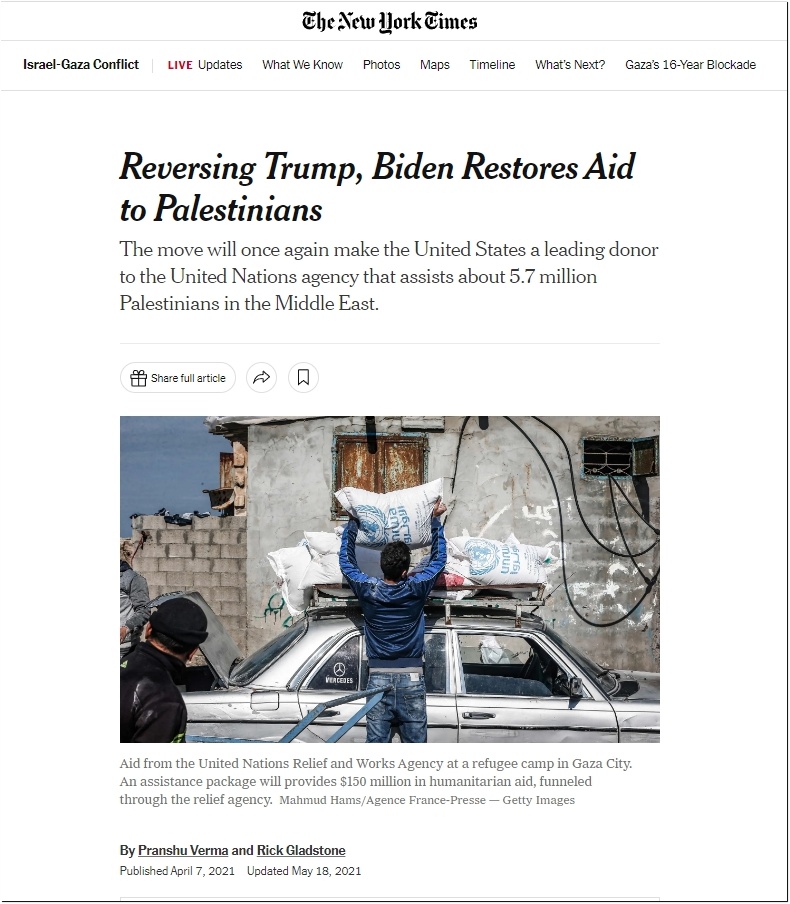 “Reversing Trump, Biden Restores Aid to Palestinians”