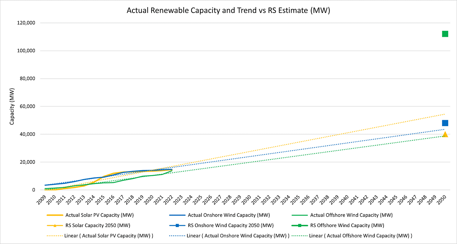 Figure 6 below compares the evolution of actual installed capacity of offshore wind, onshore wind and solar to the 2050 targets set in the RS report.