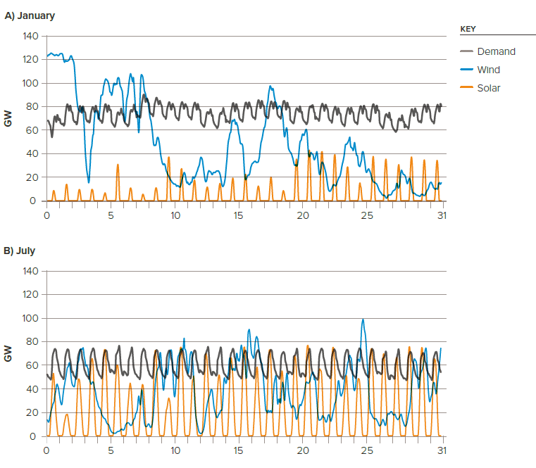 The other curious thing is that they fail to explain how their planned 40GW of installed solar capacity manages to produce peak output of nearly 80GW on many days in July (see Figure 1). There is clearly some other hidden flaw in their modelling.