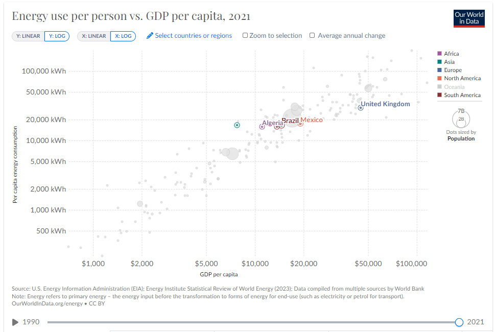 Second, this matters because there is a strong positive correlation between per capita energy consumption and per capita GDP. There are no rich countries with low energy use (see Figure 1).