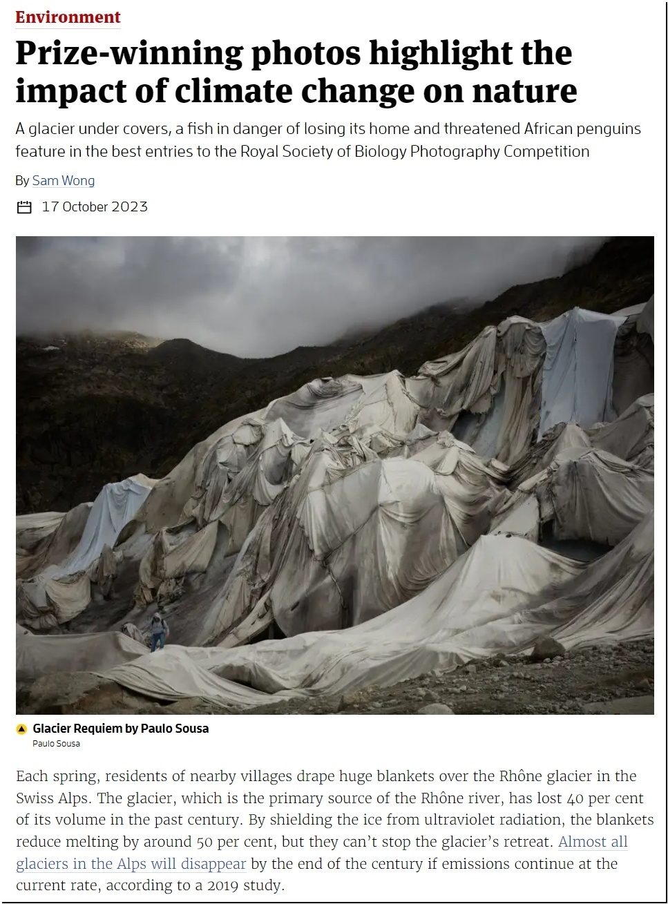 “Each spring, residents of nearby villages drape huge blankets over the Rhône glacier in the Swiss Alps. The glacier, which is the primary source of the Rhône river, has lost 40 per cent of its volume in the past century. By shielding the ice from ultraviolet radiation, the blankets reduce melting by around 50 per cent, but they can’t stop the glacier’s retreat. Almost all glaciers in the Alps will disappear by the end of the century if emissions continue at the current rate, according to a 2019 study.”
