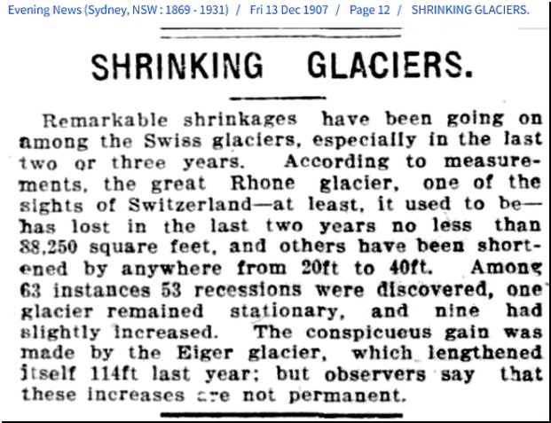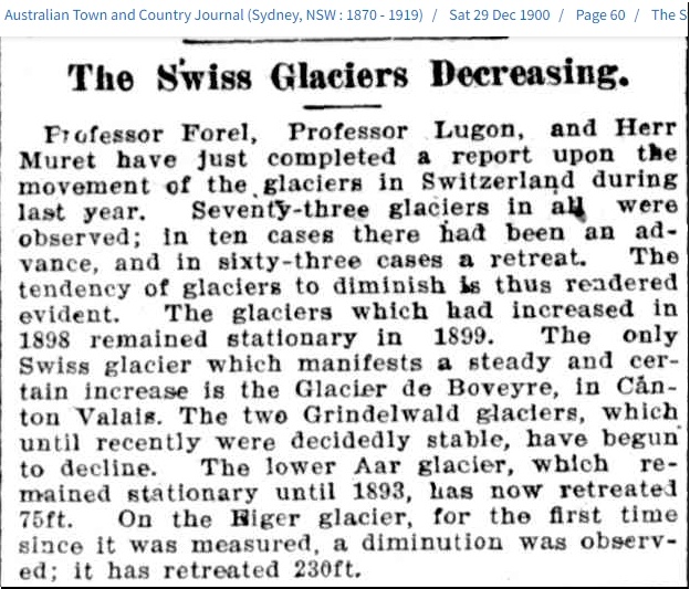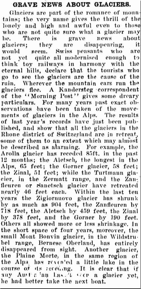 “Remarkable shrinkages have been going on among the Swiss glaciers, especially in the last two or three years. According to measurements, the great Rhone glacier, one of the sights of Switzerland—at least, it used to be— has lost in the last two years no less than 88,250 square feet, and others have been shortened by anywhere from 20ft. to 40ft. Among 63 instances 53 recessions were discovered, one glacier remained stationary, and nine had slightly increased. ”