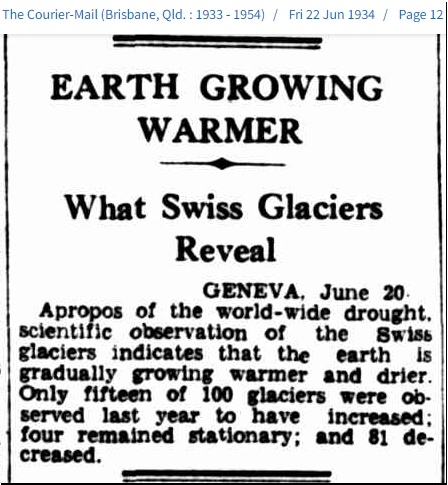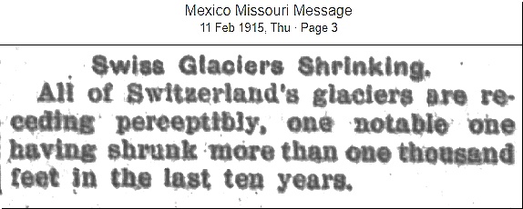 “Apropos of the world-wide drought, scientific observation of the Swiss glaciers indicates that the earth is gradually growing warmer and drier. Only fifteen of 100 glaciers were observed last year to have increased; four remained stationary; and 81 decreased.”