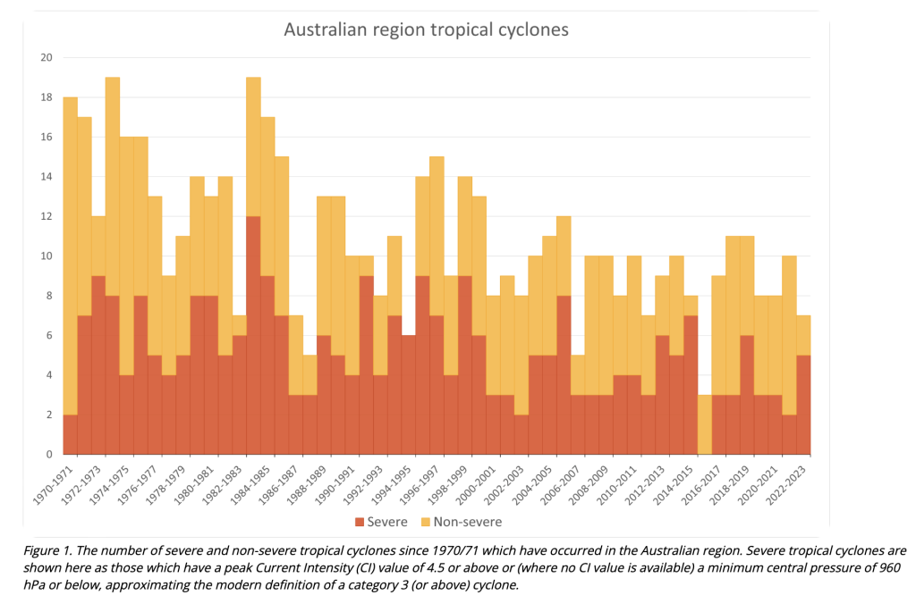 For the last twenty years various international working groups associated with the IPCC and World Meteorological Organisation have been making submissions and predictions regarding the likely effects of global warming on tropical cyclones. These reports have indicated the maximum intensity of cyclones is unlikely to significantly increase, certainly not beyond 10-20 percent. A ‘Statement on Tropical cyclones and Climate Change’ in 2006 by Dr G. B. Love the Permanent Representative for Australia indicated that rainfall intensity could increase, due to the increasing water vapour content of the atmosphere. Twenty years later, the data shows that both the intensity and number of cyclones has been declining.