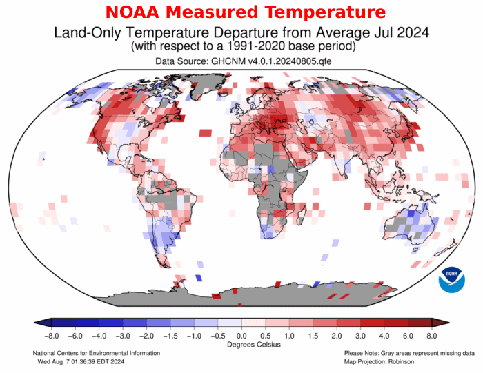 NOAA measured land temperatures in July were a mixture of warm and cold, but NOAA tampered with the data to create a bright red map.