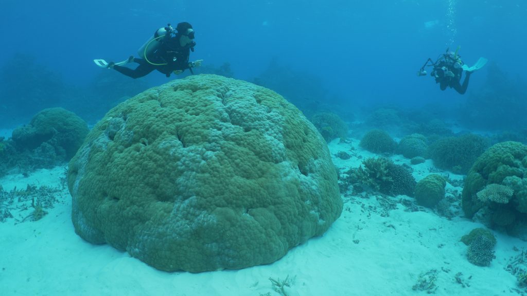 How do we know that in the back lagoon at Myrmidon Reef there are some massive bolder corals – immovable, representing layer upon layer of calcium carbonate laid down year after year, back more than 300 years.