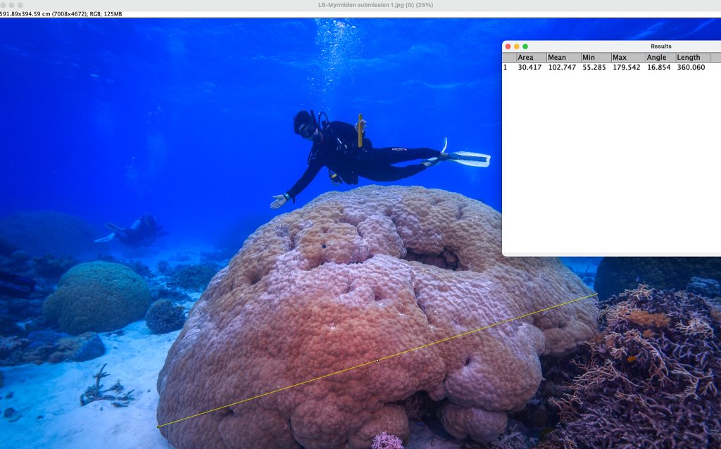 I measured the height and width of the largest coral colonies from their submissions using ImageJ software and the reference within each photograph – their yardsticks.