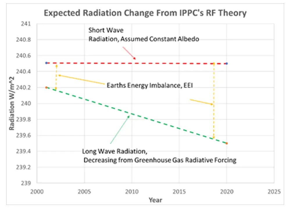 - The IPCC’s current theory (radiative forcing, RF) is that in the upper atmosphere CO2 via Planck’s Law and Kirchhoff’s Law will absorb long wave radiation and reflect heat back to the lower atmosphere. To prove this theory NASA put the CERES satellite up to measure the radiation related to this theory. RF theory should show relatively constant short wave, SW, radiation out and decreasing long wave, LW, radiation out with time See Figure 1. Twenty years of CERES data analyzed by Dübal et al (15)and Loeb et al (16) show SW out decreasing and LW out radiation increasing over the 20 years, contrary to RF theory, see Figure 2. Their papers also indicated there may be some evidence of RF but clouds were the main source of SW and LW change over the 20 years.