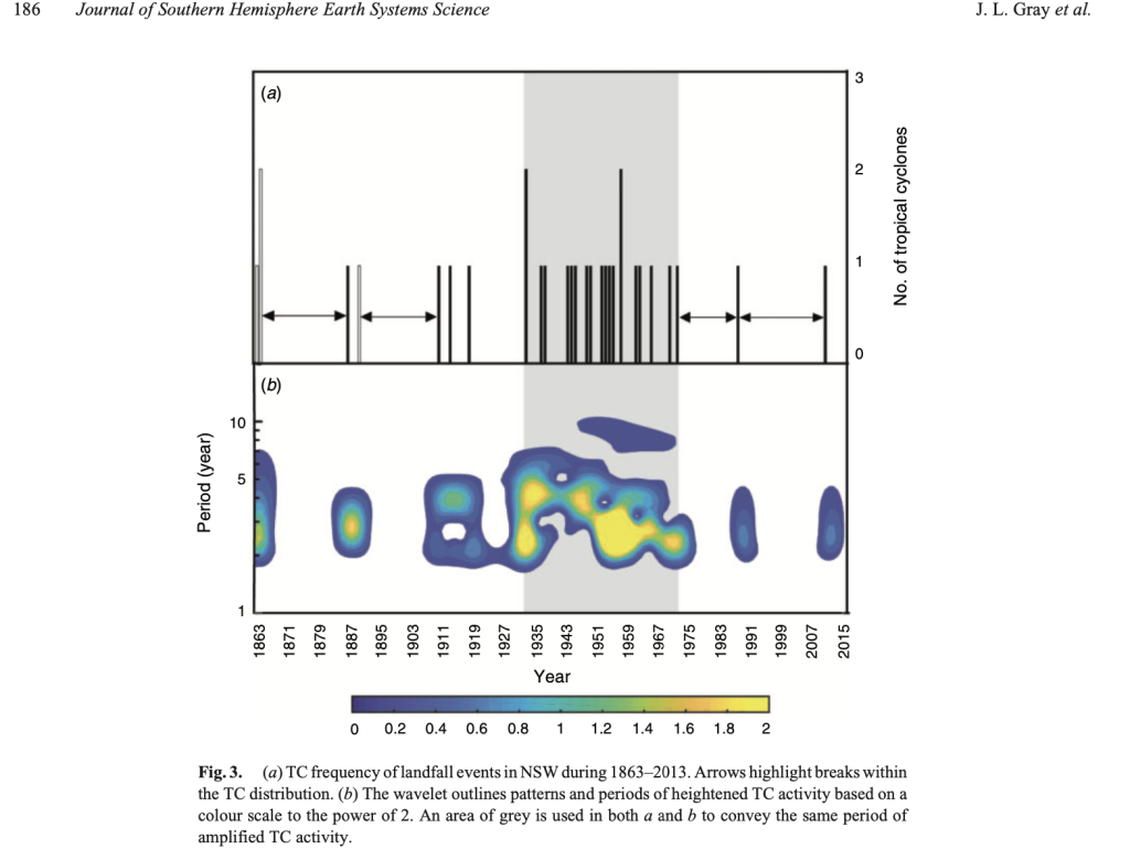 In fact, during the period 1935 to 1974 every other year there was a cyclone making landfall as far south as Brisbane and into New South Wales. There were two cyclones making landfall as far south as New South Wales in 1934: on January 30th and then again on February 19th. Two cyclones also made landfall in New South Wales in 1959: TC Beatrice and TC Connie. These four cyclones are listed in a journal article by J.L. Gray et al. entitled ‘On the Recent Hiatus of Tropical Cyclones Landfalling in NSW, Australia’ published in the Journal of Southern Hemisphere Earth Systems Science in 2020.