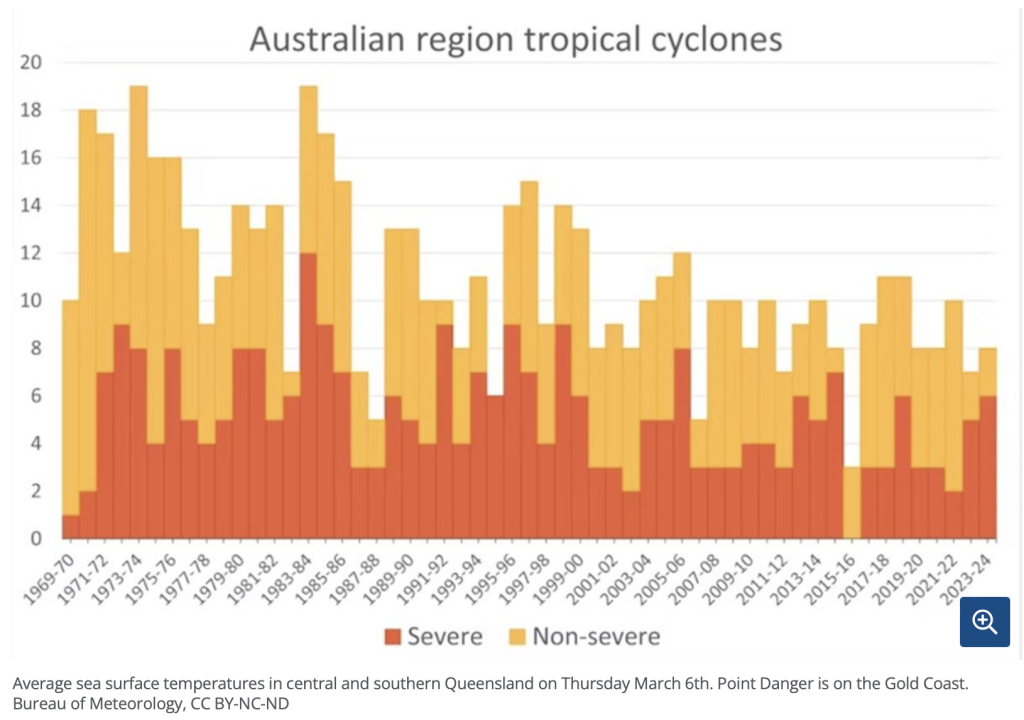 Contrary to popular narratives cyclones are not becoming more intense, and their frequency is waning. CSIRO research has confirmed a statistically significant downward trend in the annual number of tropical cyclones in the Australian region over the period extending from 1981/82 to 2017/18 that is during the satellite period. The intensity of these cyclones is also in decline.