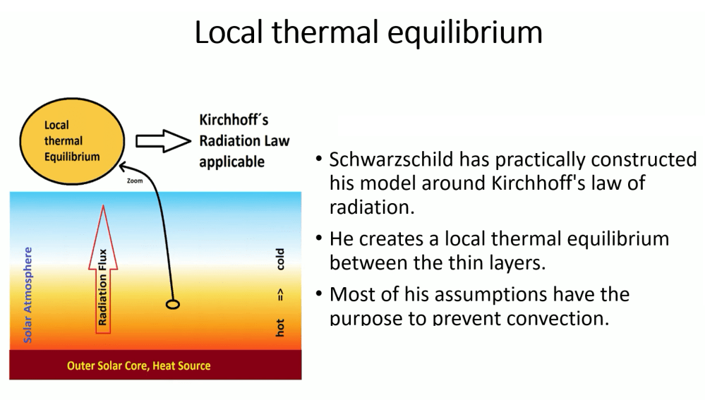 To summarize and formulate this somewhat more abstractly: In order to create the conditions for Pure radiation transport through the solar atmosphere Schwarzschild must construct an atmosphere with a very high degree of order. In liquid or gaseous systems even minor disturbances will cause such a state to change into a disordered convective State. Under convective conditions Kirchhoff’s law of radiation and thus the radiative transfer equation are not valid.