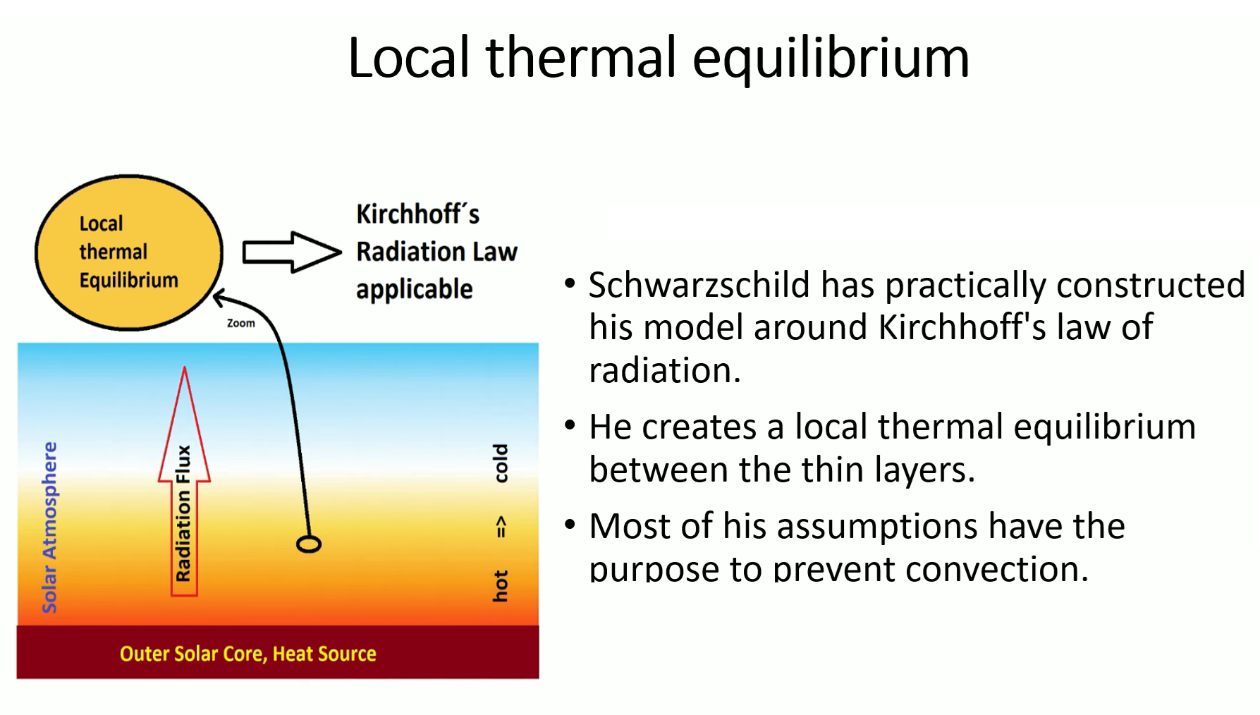 To summarize and formulate this somewhat more abstractly: In order to create the conditions for Pure radiation transport through the solar atmosphere Schwarzschild must construct an atmosphere with a very high degree of order. In liquid or gaseous systems even minor disturbances will cause such a state to change into a disordered convective State. Under convective conditions Kirchhoff’s law of radiation and thus the radiative transfer equation are not valid.